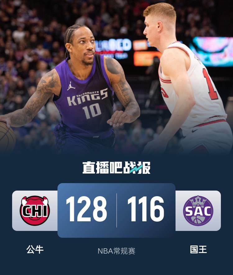 首节开打后双方互相试探,武切维奇肆虐内线不断取分,但蒙克和莱尔斯轮番发力予取予求,国王气势如虹后来居上,首节结束时国王确立11分优势,次节回来,公牛进攻依然停滞,国王一波9-0继续拉开比分,末段公牛进攻回暖及时止血,半场战罢,国王依然领先9分。易边再战后武切维奇连中三分吹响追分号角,公牛多点开花一举反超,三节结束后公牛反超3分,末节决战,怀特突然爆发连续取分,国王回天乏术,最终公牛128-116力克对手。
