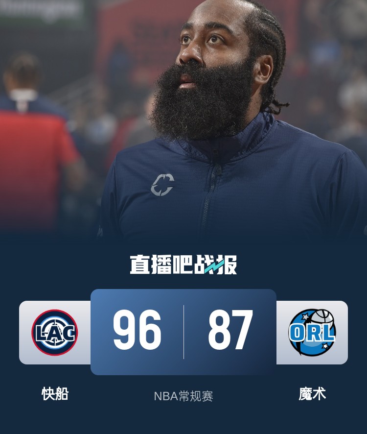 比赛开始,双方上来连续试外线手感但非常一般,打了半节都未得分上双,随后班凯罗连续杀伤得分上双,首节魔术领先6分,次节祖巴茨接连补篮,防守也上强度,快船半节13-2反超比分,暂停后魔术突然找回感觉回应16-2攻击波半场还是领先2分。下半场,双方展开拉锯战,哈登防守端接连抢断反击带队反超比分并重新取得领先,小瓦也是连续止血三节追到仅差3分,末节双方继续拉锯战,鲍威尔接连突破上篮稳住局势,博格丹一攻一防再次拉开两球以上领先,哈登连续切帽,快船牢牢掌握主动权,小卡反击暴扣杀死比赛,最终快船96-87力克魔术。