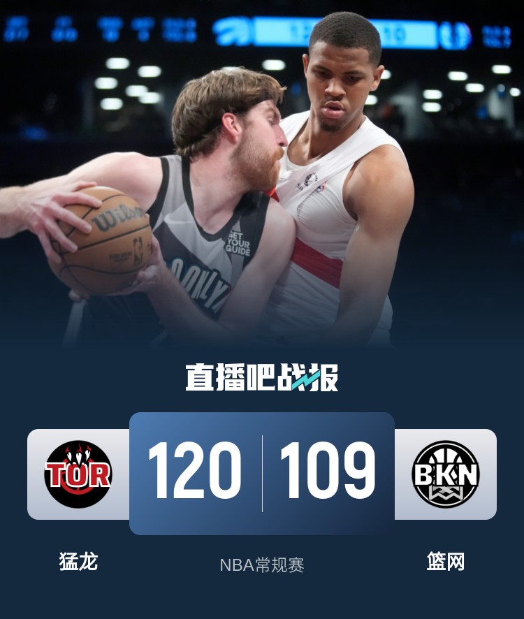 比赛开始,双方上来状态都比较慢热,篮网主攻内线,猛龙外线能回应并打出9-0小高潮建立主动权,首节猛龙领先5分,次节篮网发力继续攻击内线直接追平比分,巴特尔里突外投给出回应,随后篮网断电,猛龙打出15-3攻击波一举领先到双位数。下半场,猛龙上来7-1拉开20分以上领先,篮网中锋德鲁-蒂米里突外投助队追分,双方拉锯战,三节猛龙还领先10分,末节双方展开对攻战,猛龙多点开花始终保持十几分领先,最终猛龙120-109力克篮网,终止3连败。