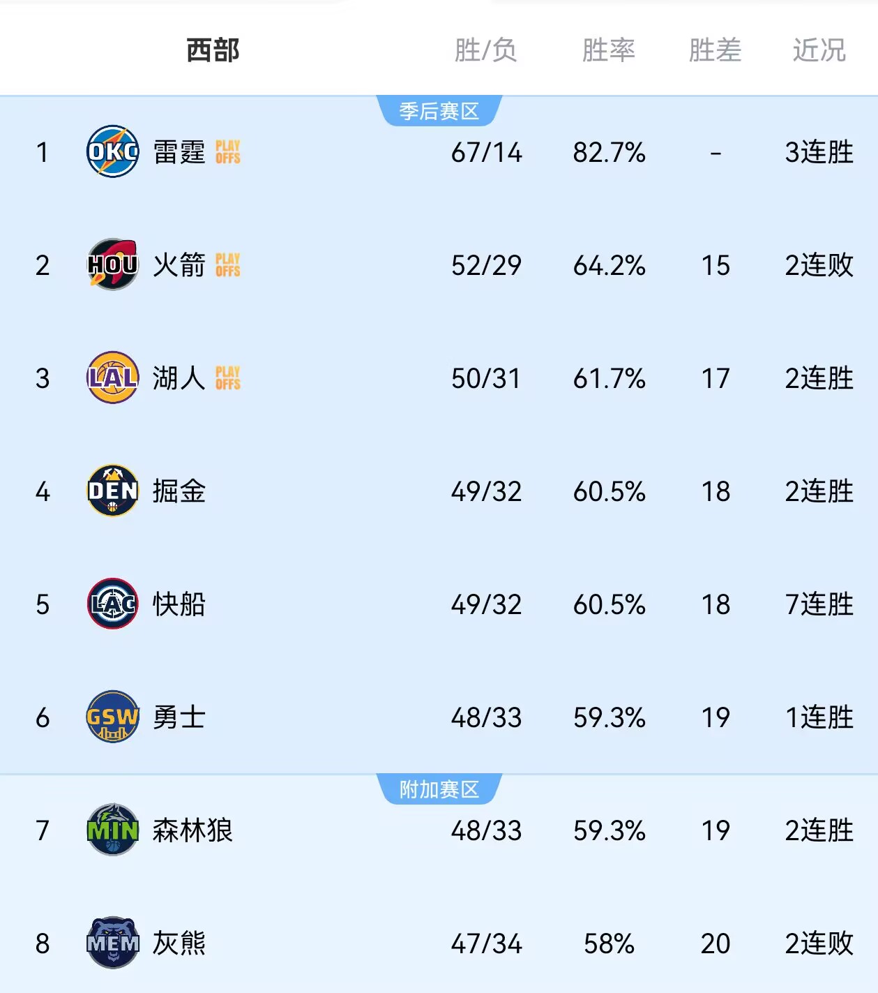 - 掘金(4)、快船(5)、勇士(6)、森林狼(7)、灰熊(8)