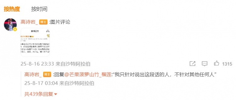 在这条动态的评论区,高诗岩晒出了媒体人贾磊此前的一段言论,并解释只针对说出这段话的人,不针对其他任何人。