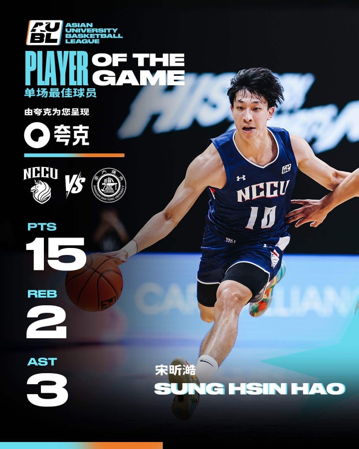 此役,政治大学6人得分上双,其中后卫宋昕澔9投6中拿下15分2篮板3助攻1抢断,荣膺本场最佳球员;中锋波波卡拿下14分12篮板2盖帽。