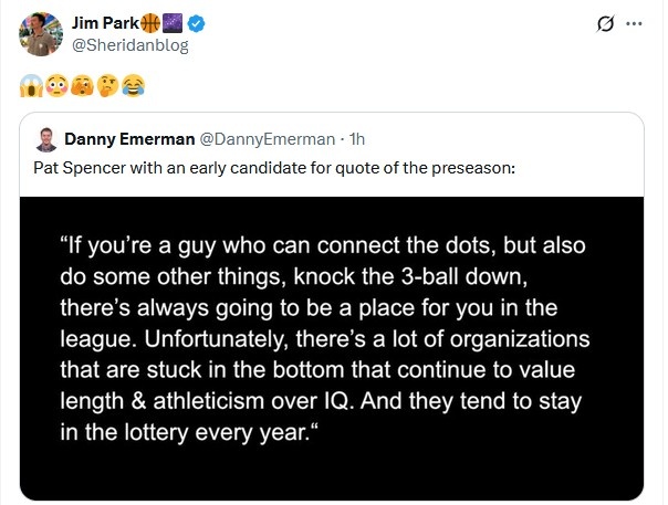 勇士后卫斯潘塞在接受采访时表示:“如果你能串联起球队,还能投进一些其他球、比如三分球,那么联盟里总有你的位置。可惜的是,很多垫底球队仍然更看重身高臂长和运动能力,而不是球商。他们往往每年都只能留在乐透区。”