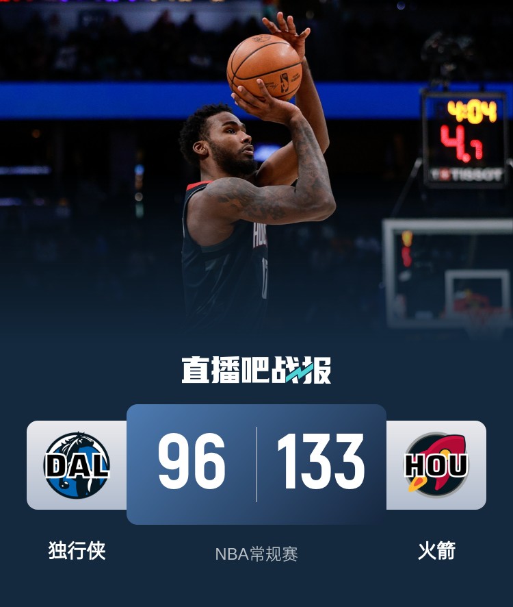 比赛开始,火箭率先发力取得领先,独行侠多点开花奋力追赶,双方陷入缠斗,比分咬得很紧,次节火箭攻防两端压制对手,内外开花获得两位数领先,埃克萨姆伤退,丁威迪带队追赶,半场战罢火箭62-49领先独行侠。易边再战,火箭牢牢占据场上主动,全面开花一举将优势扩大到30分以上,末节独行侠仍无起色,火箭稳扎稳打将优势保持到最后。最终,火箭133-96大胜独行侠。