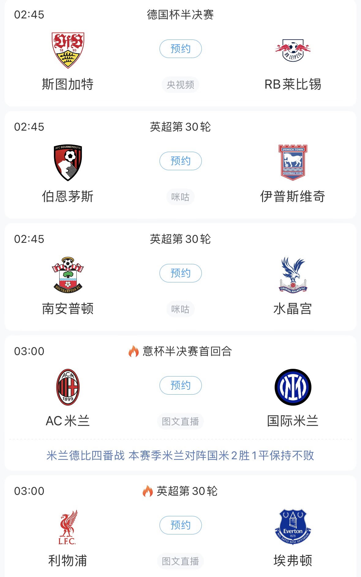 03:00 AC米兰vs国际米兰(意杯半决赛首回合)