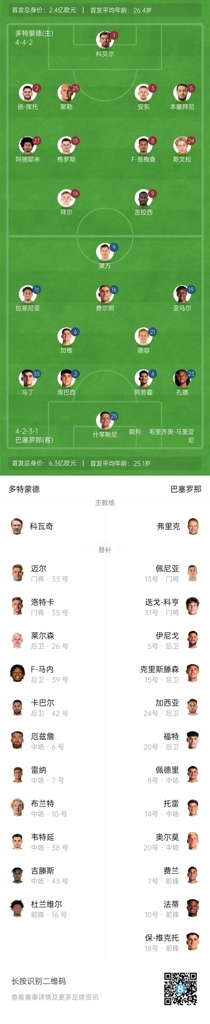 4月16日讯 凌晨03:00,欧冠1/4决赛次回合,多特蒙德主场迎战巴塞罗那,赛前首发名单公布。