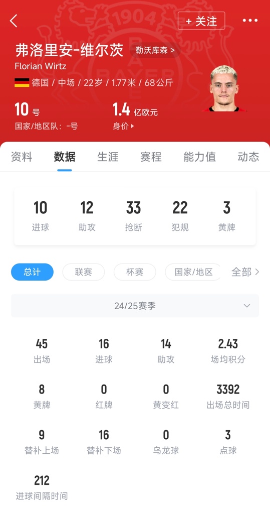 维尔茨现年22岁,本赛季代表勒沃库森出战45场,首发36次,贡献了16球14助攻。目前,维尔茨德转身价为1.4亿欧。他在勒沃库森帮助球队获得过1次德甲冠军、1次德国杯冠军和1个德超杯冠军。维尔茨与药厂原本的合同2027年到期。