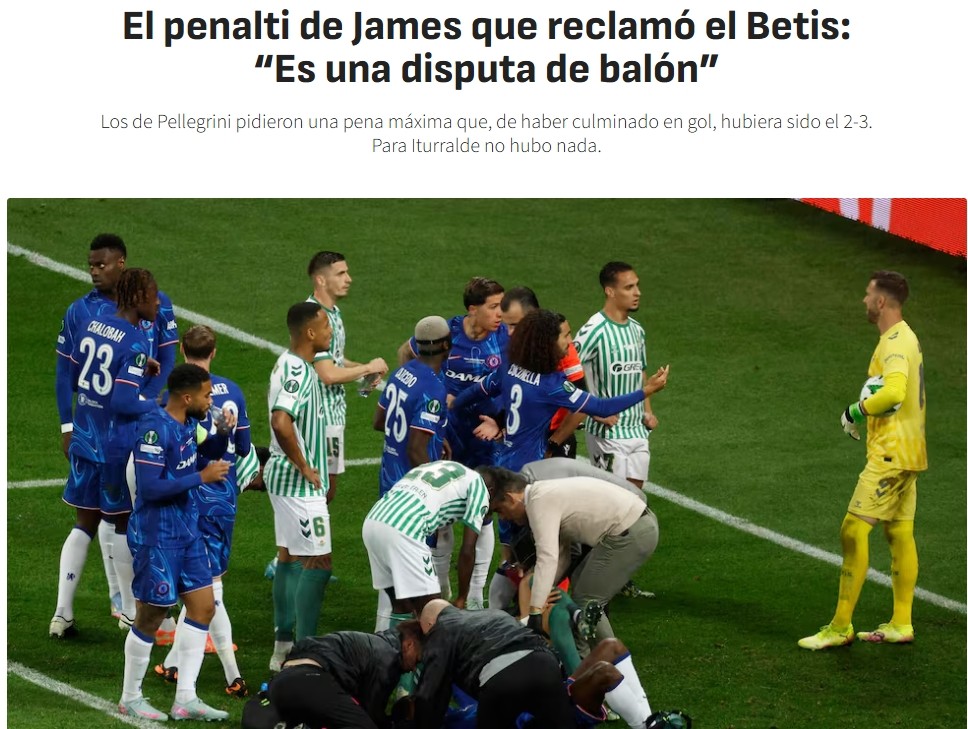 阿斯报表示这场残酷的失利对于绿白军团来说,伴随着一些争议。第85分钟,当贝蒂斯1-3落后并在绝望中寻求进球以梦想奇迹时,热苏斯-罗德里格斯-因里斯-詹姆斯-在禁区内手球而要求判罚点球。然而,无论是主裁判伊尔凡-佩尔托-还是VAR裁判杰罗姆-布里萨尔-都没有认为有任何可判罚的犯规。