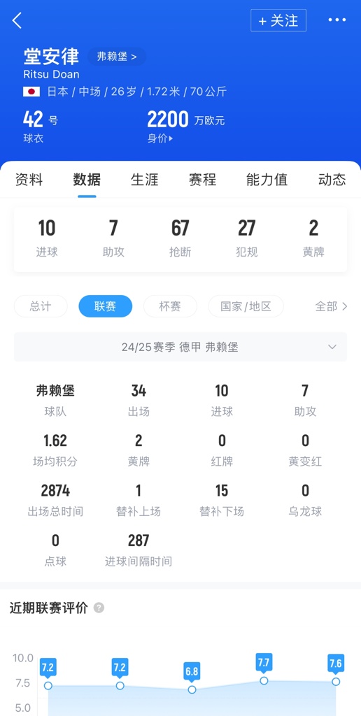 堂安律本赛季为弗赖堡联赛出场34场,取得10粒进球与7次助攻,目前其德转身价预估为2200万欧元。