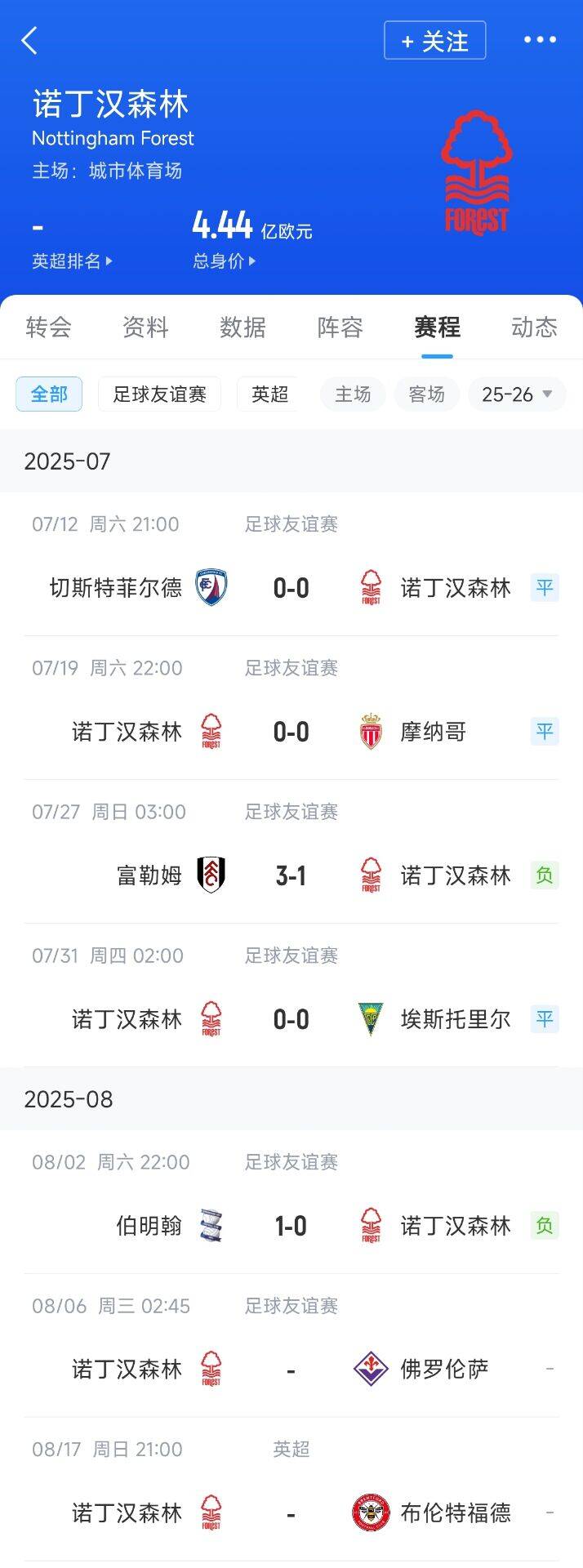 这其中森林打英乙队伍切斯特菲尔德球队不是主力,其他比赛基本都是半主力或全主力,但是一场也没赢。