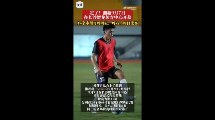 长沙发布报道称,湘超将于2025年9月至12月举行,9月7日在长沙贺龙体育场举行开幕式和揭幕战。比赛为期17周,分别在14个市州进行98场比赛,每周周五、周六、周日比赛,同一轮各场比赛时间相对错开。