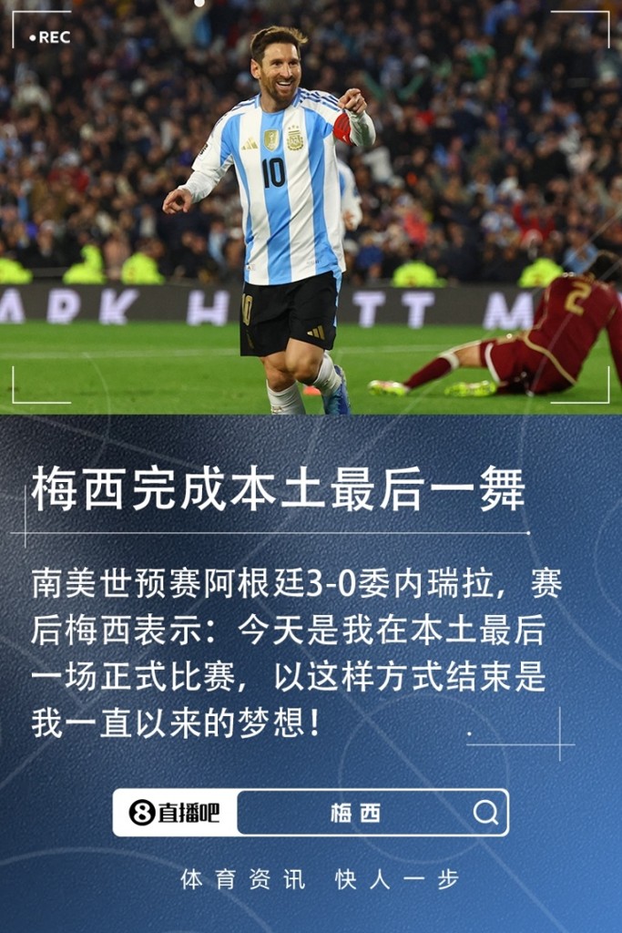 09月05日讯 南美世预赛第17轮,梅西梅开二度,阿根廷3-0委内瑞拉。赛后梅西接受了采访,他表示这是他在阿根廷主场的最后一场比赛。