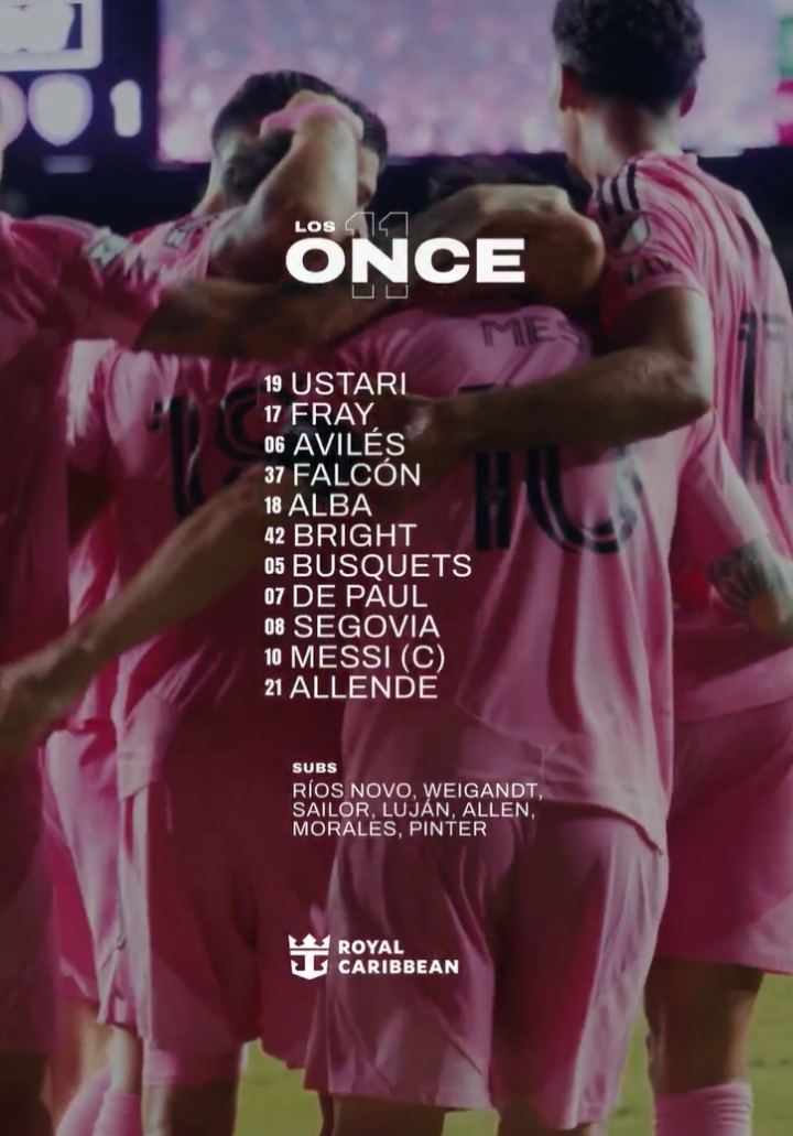 迈阿密国际首发:19-乌斯塔里、17-弗雷、6-阿维莱斯、37-法尔肯、18-阿尔巴、7-德-保罗、42-布莱特、5-布斯克茨、8-特拉斯科、10-梅西、21-阿连德