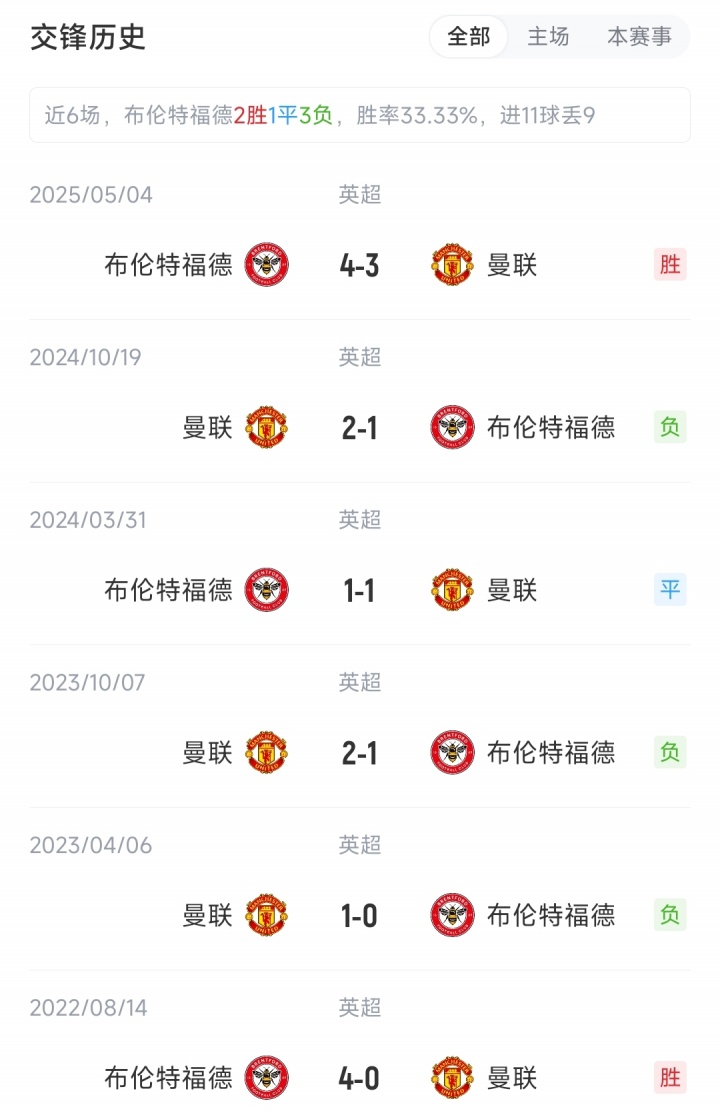 截至赛前,曼联2胜1平2负积7分,排名英超积分榜第11;布伦特福德1胜1平3负积4分,排名英超积分榜第17。