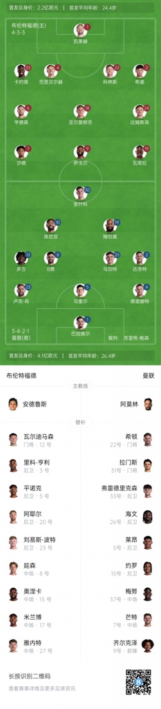 布伦特福德替补:12-瓦尔迪马森、3-里科-亨利、5-平诺克、20-阿耶尔、23-刘易斯-波特、8-延森、15-奥涅卡、27-雅内特、17-米兰博
