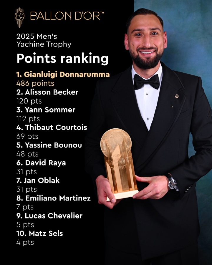 09月27日讯 2025年雅辛奖排名详情公布,荣获该奖项的意大利门将多纳鲁马以486分断层领先,第2名阿利森获得120分,第3名索默获得112分。