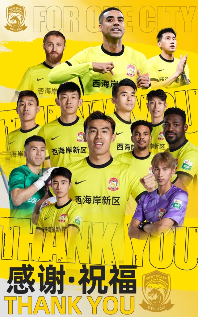 鹏程万里,前程似锦!经过与球员友好协商并达成一致,买尔旦江-阿不都克力木、刘谱锦、雷文杰、阿兰、比乌奎尔、谭凯元、叶尔杰提-叶尔扎提、哈罗扬、季家葆、里亚斯科斯、朴世豪、金洋洋、陈祥煜正式告别青岛西海岸队。尽管未来的征程无法继续并肩作战,但我们珍惜曾经共同拼搏的岁月,一起努力奋斗取得的成绩和分享胜利的喜悦!